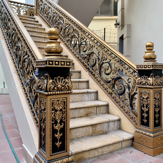 Cầu thang nhôm đúc - 05 với hoa văn tinh xảo, chịu lực cao, chống oxy hóa, mang đến không gian sang trọng, hiện đại và an toàn tuyệt đối cho biệt thự, nhà phố và công trình cao cấp.
